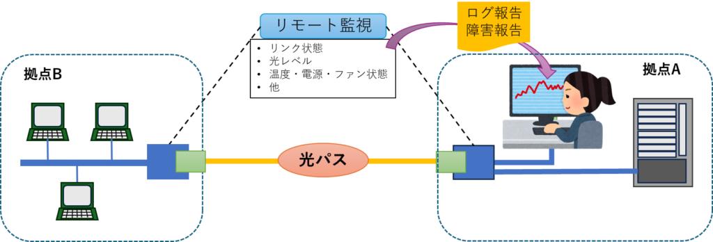 もちろん故障や障害の可能性はゼロではありません。しかし一方で、過度の保守体制は大きなコスト増の要因となります。そこでご要望に応じた光パスの監視・保守体制を提供いたします。まず基本となる監視対象は、光信号のリンク状態、光トランシーバの光入出力レベル、端末機器の電源・温度・ファン回転数などの物理的状態などで、24時間365日監視し定期的にログ報告を行い、故障や障害時には、緊急メールを自動配信いたします。